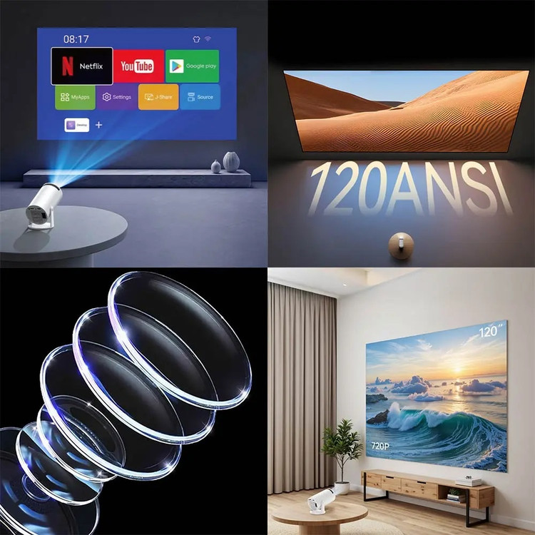 پروژکتور قابل حمل YESIDO TV14 با رزولیشن 1280*720P و چرخش 180 درجه بالا و پایین که تصویر 2.69 اینچ را پروجکت میکند همچنین وای فای 6 و بلوتوث 5.0BT آن از جدید ترین فناوری ها برای سرعت های بالاتر و تاخیر کمتر است. تراشه داخلی بلوتوث 5.0 برای اتصال آسان به بلندگو و هدست های بلوتوث است. تصحیح خودکار KEYSTONE که دارای فوکوس دستی و تصحیح خودکار با یک حسگر با دقت بالا برای فوکوس سریع تر و دقیق تر است.
